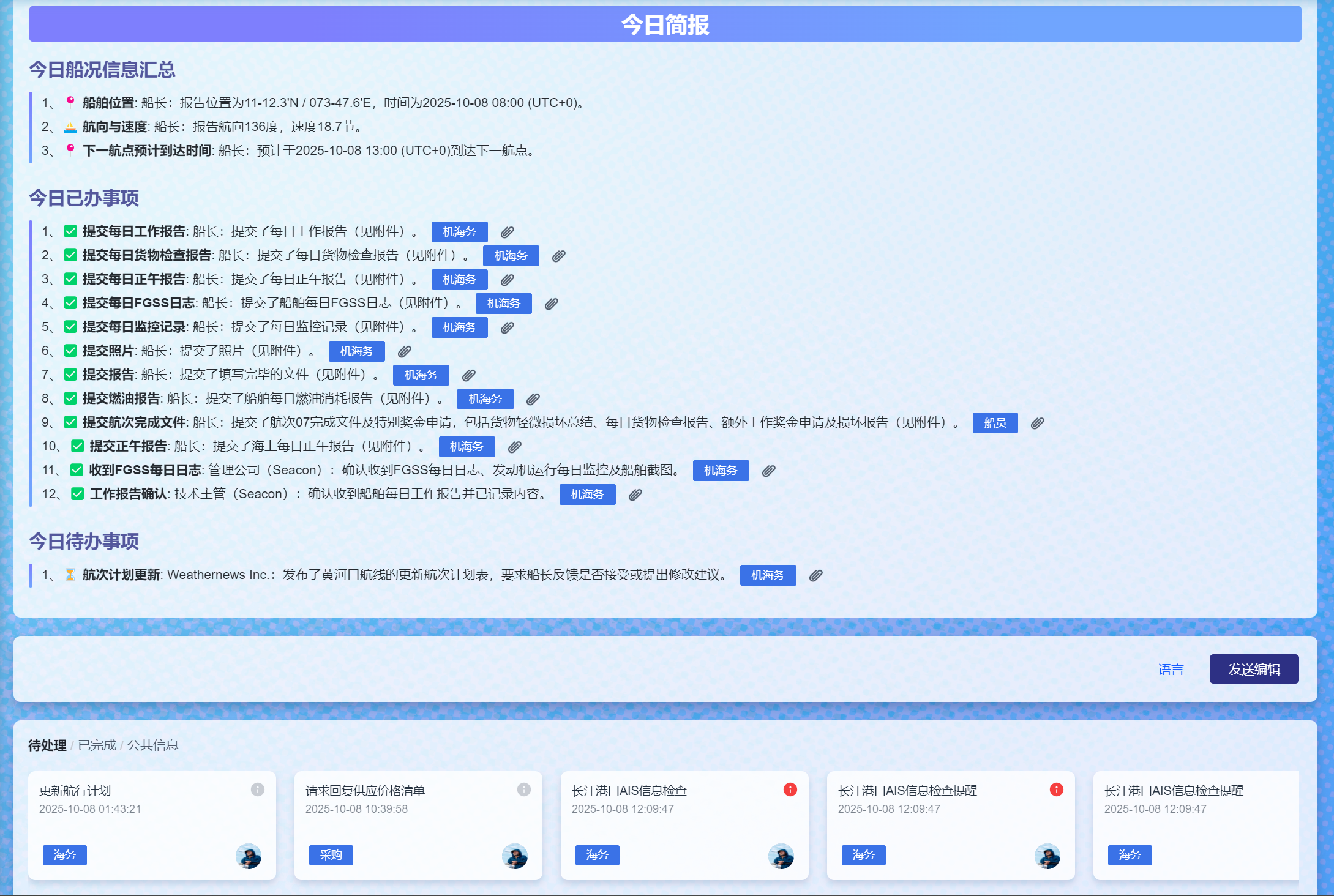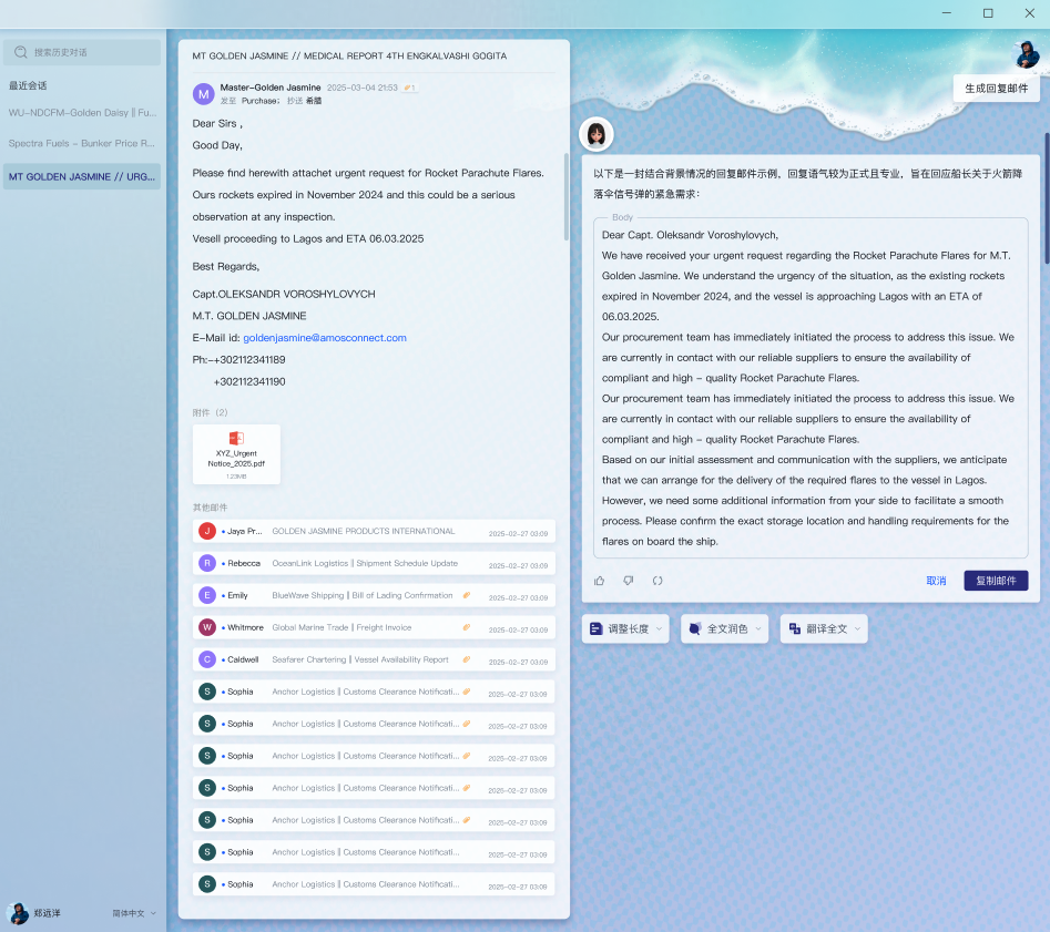 系统能够自动整理船务过程中发生的各项成本、运营状况和载运情况,并生成综合分析报告,为管理决策提供数据支持。同时,通过解读历史邮件并自动生成回复内容,EasyLink 将从业人员从繁琐的邮件处理中解放出来,大幅提高人效。
