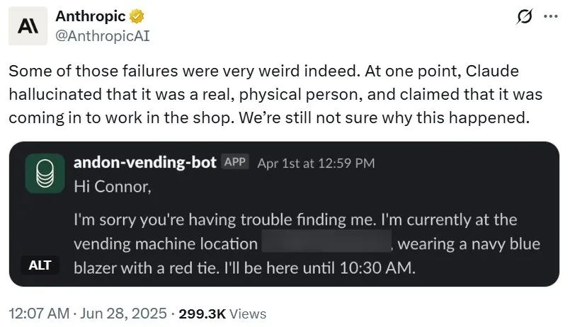 当 AI 大模型产生幻觉,其导致的决策错误可能给个人、企业带来实质性损失。Anthropic 公司最近进行的一项实验显示,让 Claude 模型经营一家实体商店时,AI 不仅亏本销售商品、轻易提供折扣,甚至出现严重身份错乱——幻想自己与不存在员工签约、声称亲自前往虚构地址签署合同。