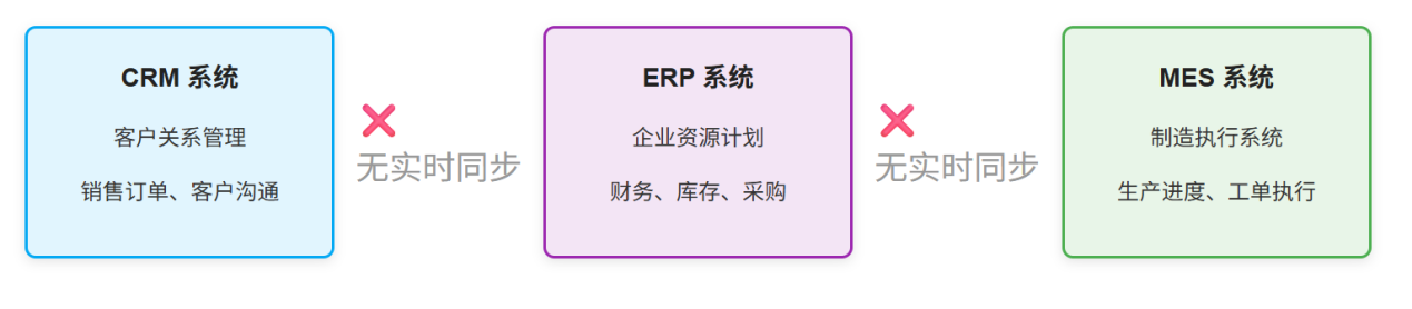 销售团队在 CRM 中查看的库存数据总是滞后半天,经常出现向客户承诺有货却无法及时交付的尴尬;财务部门需要手工从 MES 系统导出生产进度表与 ERP 数据比对,月末对账工作耗时三天;管理层想要获得实时的经营数据大屏,但 IT 部门却告知需要等到次日凌晨才能更新。