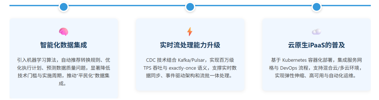 传统的 ETL 开发依赖大量手工编码和配置工作。新一代平台开始引入机器学习算法,通过数据分析自动推荐转换规则、优化执行计划、预测数据质量问题。这将显著降低数据集成项目的技术门槛和实施周期。