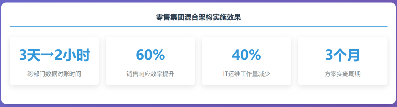 项目上线后,跨部门数据对账时间从 3 天缩短到 2 小时,销售团队的客户响应效率提升 60%,IT 运维工作量减少 40%。