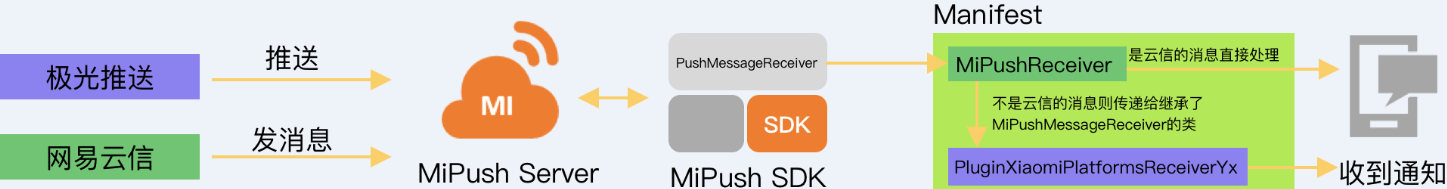 可以看到极光提供的这个 arr 包中直接把小米官方提供的 MiPush_SDK_Client_3_6_18.jar(处理小米厂商推送的 SDK) 包了进来,同时提供了一个 PluginXiaomiPlatformsReceiver 类,让其继承自上述小米 jar 包中的 PushMessageReceiver 打包后 PluginXiaomiPlatformsReceiver 会被添加到 Manifest 文件,当系统收到推送后,会将消息转发到继承了 PushMessageReceiver 的类,所以 PluginXiaomiPlatformsReceiver 就会收到消息,并将消息传递给极光自己的 SDK 进行处理,后面的流程就和 App 在前台的推送流程一样了。简单总结下这个 Plugin 类:**Plugin 类会被注册到 Manifest 从而接收系统消息,并在对应的回调方法中将消息转发给极光 SDK 处理。**在网易云信兼容厂商推送之前这一切工作的都很好,应用进程被杀后,push 推送可正常收到,问题从云信消息推送兼容厂商推送开始: