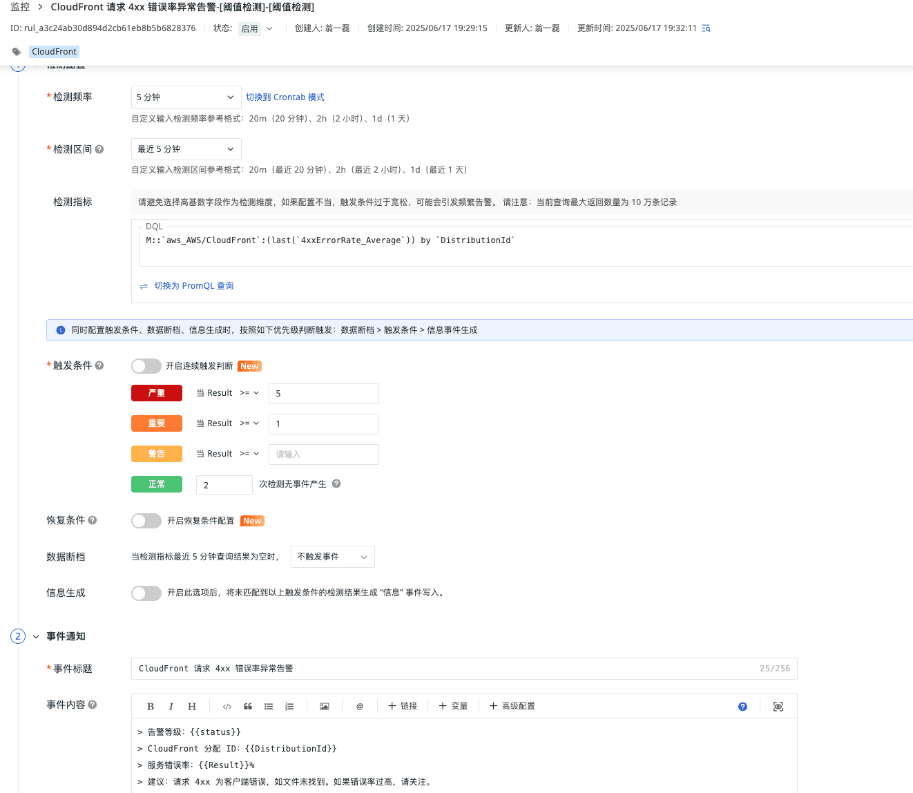 针对 CloudFront,设置 4xx 和 5xx 错误率的告警,在出现问题的时候及时解决。可根据您的应用类型和业务关键性来调整告警的阈值,例如静态网站通常对错误更敏感,而某些动态应用可能会有少量预期错误。