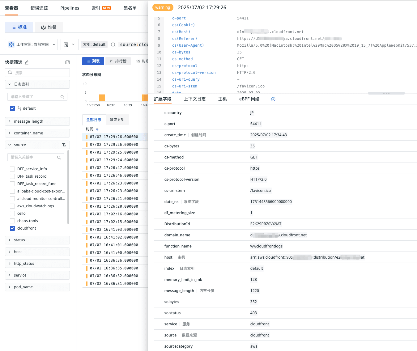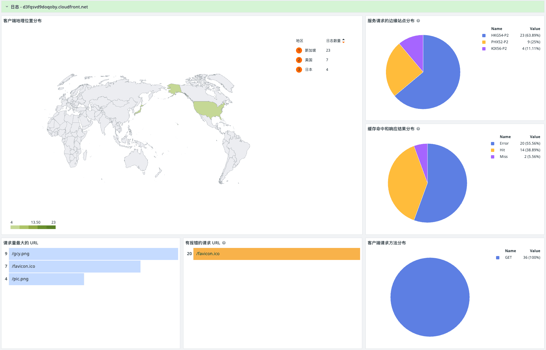 通过 CloudFront 域名访问所关联的资源,CloudFront 将生成的日志上传到 S3,通过 Lambda 函数进行抓取并上报到观测云。在观测云的日志查看器,可以通过 source:cloudfront 来进行搜索。