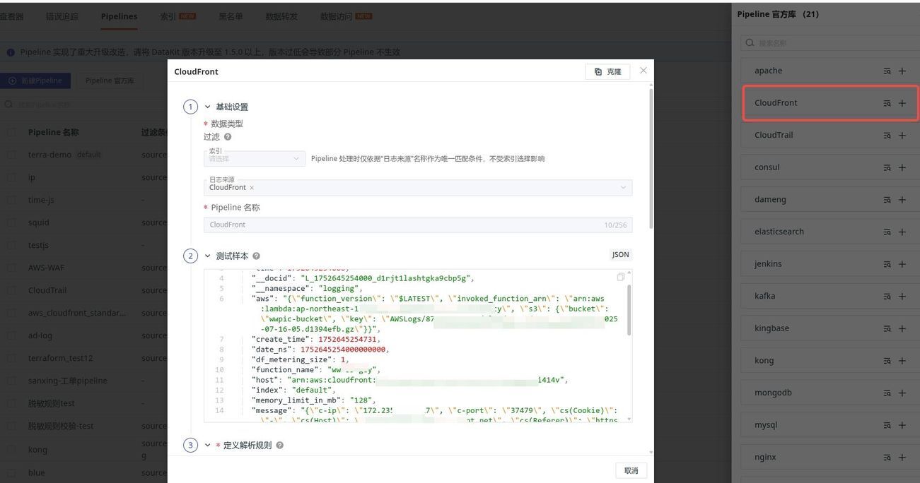 观测云 已内置了 CloudFront 日志解析,可以在【日志】 - 【Pipelines】 - 【Pipeline 官方库】 - 选择 CloudFront ,添加类型为 中心 Pipeline,保存即可,对新上报数据生效。