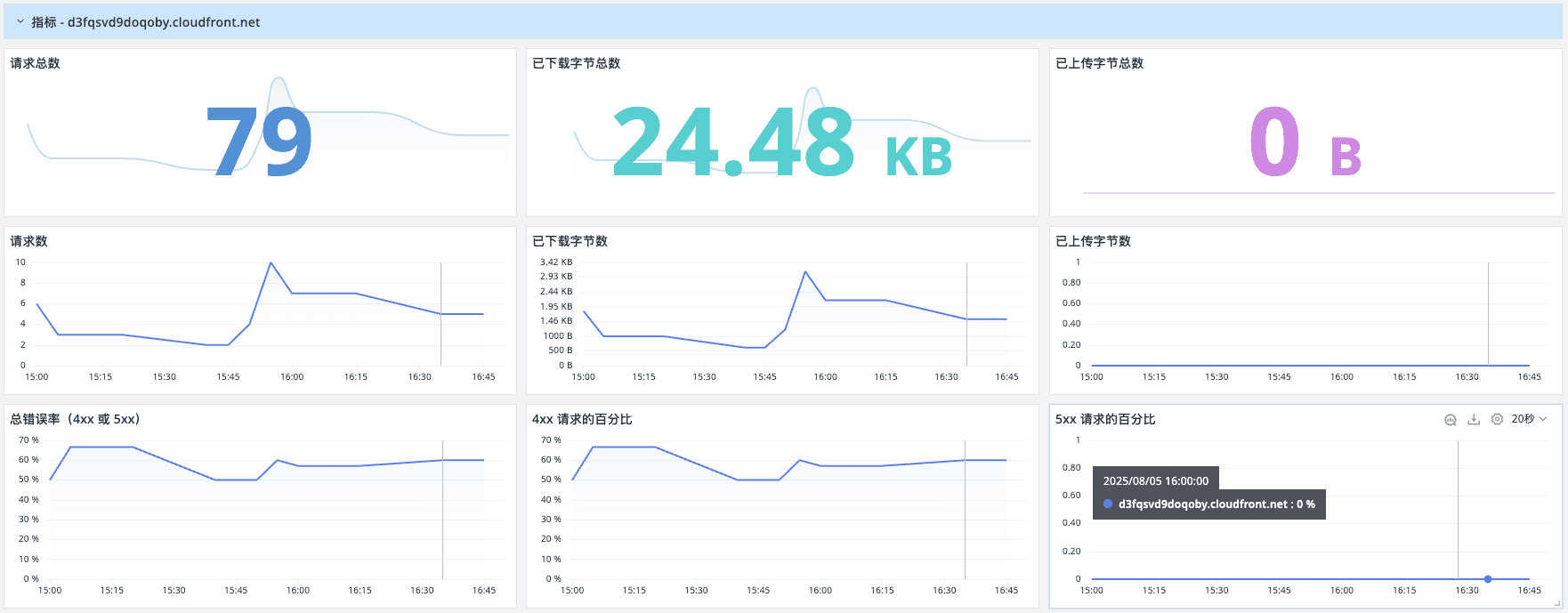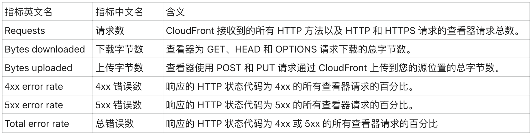 所有 CloudFront 分配都包含以下默认指标。除了默认指标外,您还可以启用其他指标,但需要支付额外费用。更多详细的信息可以参考 AWS 的文档:https://docs.aws.amazon.com/zh_cn/AmazonCloudFront/latest/DeveloperGuide/viewing-cloudfront-metrics.html