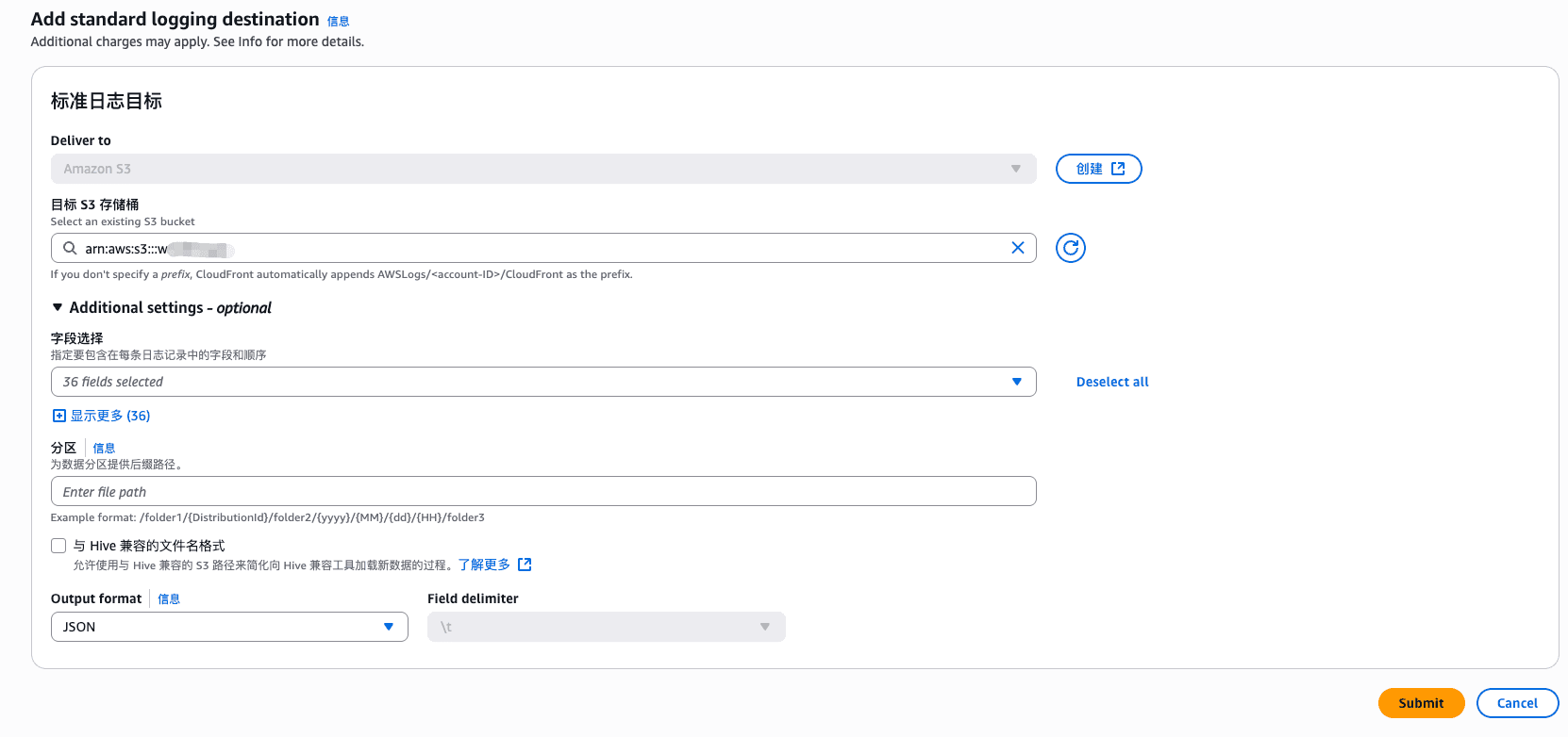 选择为日志文件创建的 S3 存储桶,选择所需的日志字段(可增加 DistrubtionId、c-country 等字段),同时选择输出格式为 JSON。