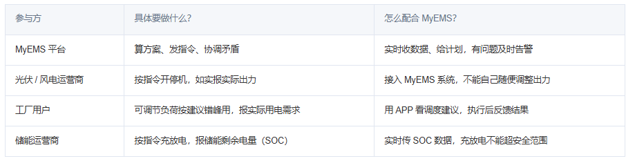 调度不是 MyEMS “一个人说了算”,得联合四方主体,明确权责,不然指令推不动: