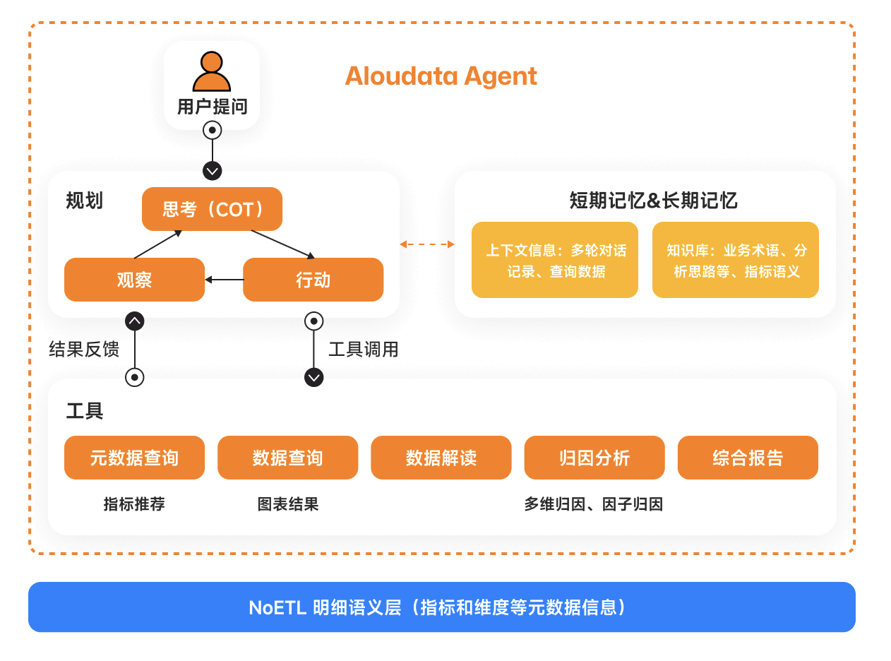 面对复杂的数据分析任务,Aloudata Agent 基于 COT 和 ReAct 的多 Agent 架构,能够自动拆解数据分析任务、动态反馈调整,并高效整合多个 Agent 的分析结果。这一架构不仅提升了复杂分析任务的解决能力,还使得分析过程更加透明化,用户可清晰查看每一步的思考结果,确保分析的准确性和可信度。