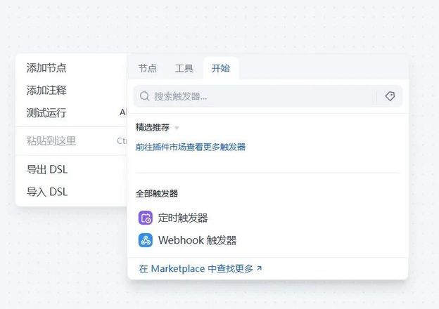 ②界⾯变化 2:新增【开始】类型节点,可以到插件市场 查看更多触发器。