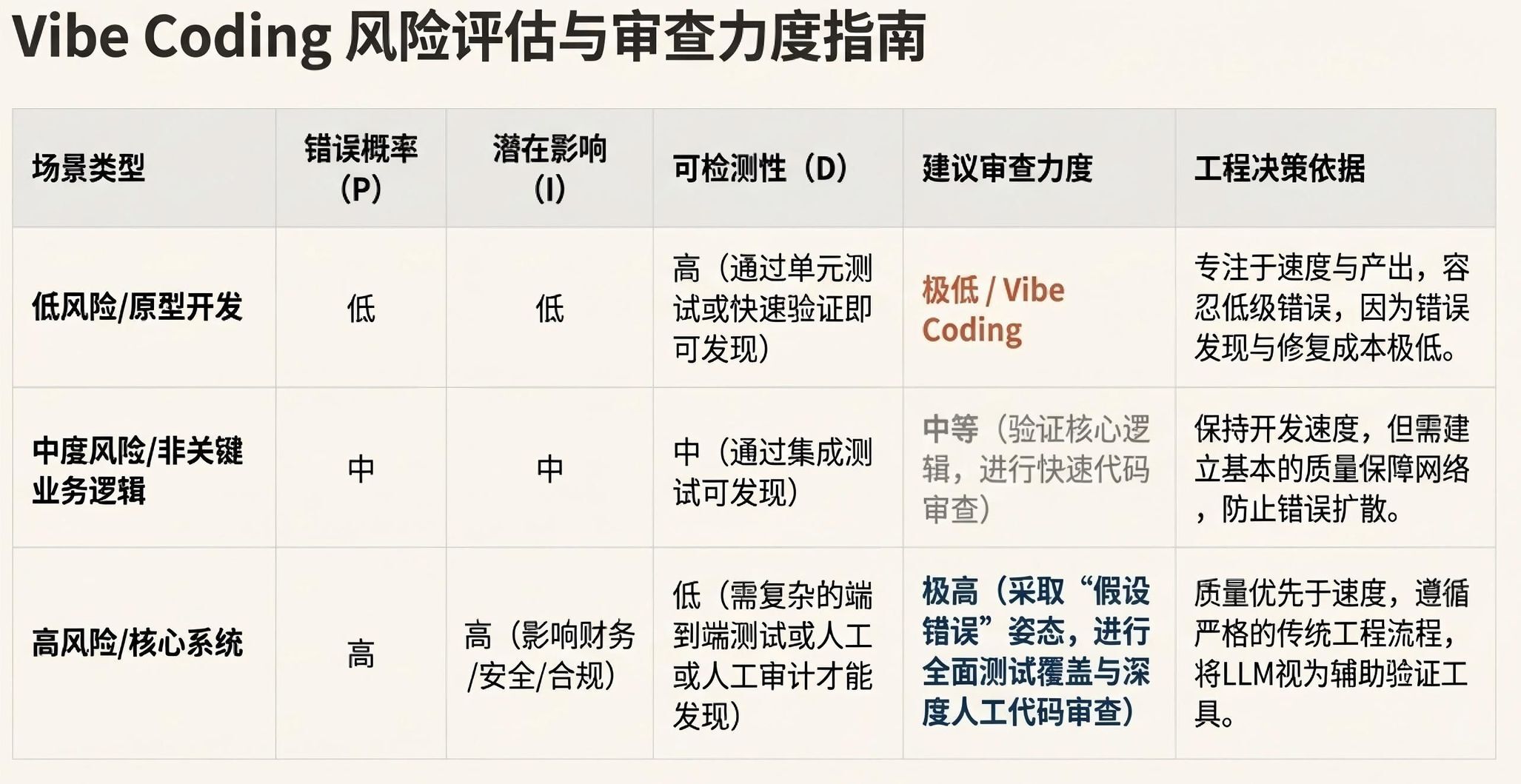 3.4 Martin Fowler 的风险评估框架(P-I-D 模型)为了系统地指导对 AI 产出代码的信任程度和审查力度,Fowler 提出了一个由三个关键因素构成的风险评估框架:- 概率(Probability, P): AI 在该特定任务上犯错的可能性。- 影响(Impact, I): 如果 AI 的输出存在错误,对业务、安全、财务或系统稳定性造成的后果。- 可检测性(Detectability, D): 错误在集成或测试阶段被发现的难易程度。审查力度 是这三个因素综合作用的结果。例如,对于涉及安全关键逻辑或复杂并发处理的任务(P 高、I 高、D 低),建议投入 极高的审查努力,并采取“假设错误”的态度进行全面测试。而对于生成样板代码或简单工具函数(P 低、I 低、D 高),则可以采用 Vibe Coding,减少对代码细节的审查。