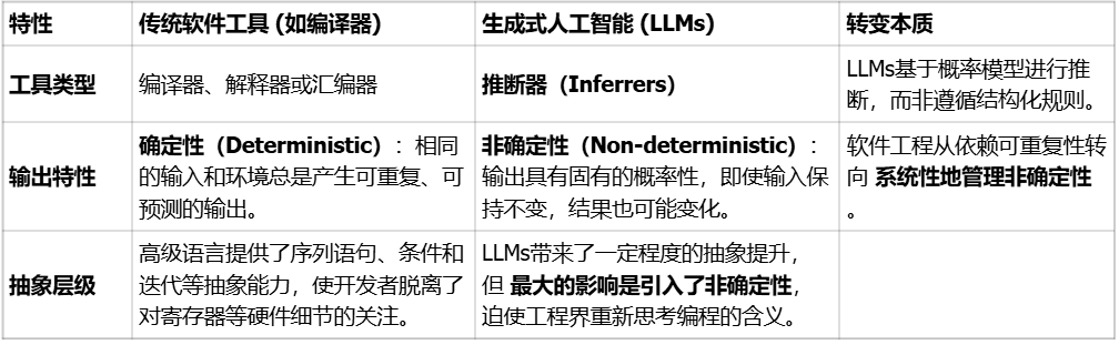 1. 核心范式转变:从确定性到非确定性 Martin Fowler 认为,生成式人工智能(GenAI)工具带来的变革,是其职业生涯中最重要的转变。他将这一转变定位为与计算机发展史上最重大的抽象层级飞跃——即从 汇编语言到第一代高级语言 的过渡——具有同等重要的意义。
