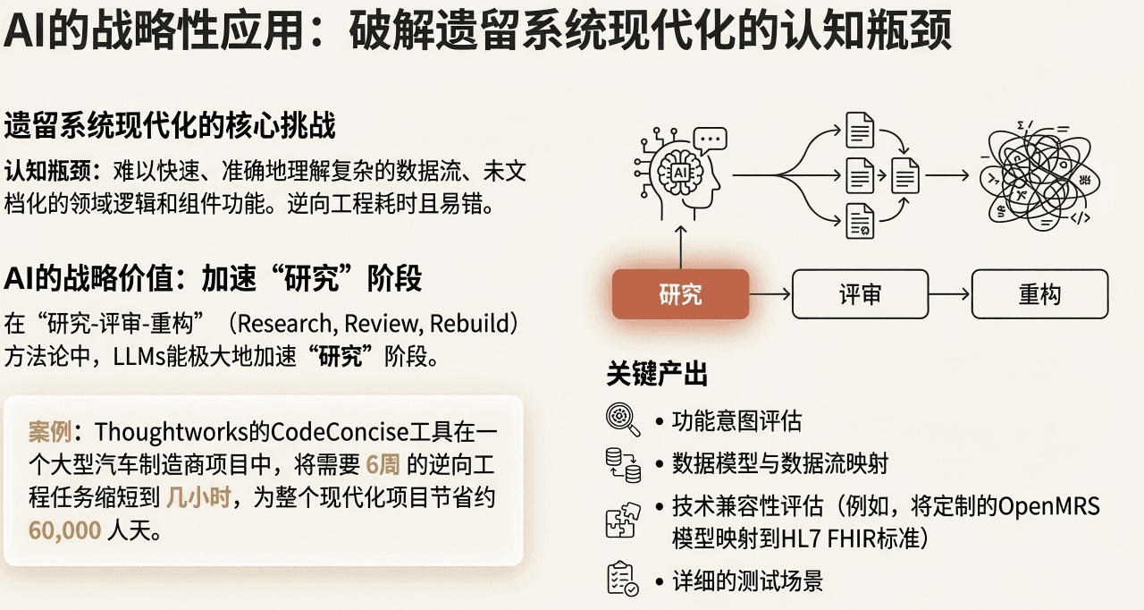 LLMs 被认为是加速遗留系统现代化的强大工具,特别是解决对现有系统的 认知瓶颈。- 加速逆向工程: LLM 可显著加速逆向工程,帮助团队在数小时内生成大量代码文档,而传统方法可能需要数周甚至数月,从而摆脱“分析瘫痪”。- “研究、评审、重构”(RRR)工作流: 这种结构化方法利用 LLMs 进行 研究,通过上下文协议增强分析(MCP-augmented LLM analysis)快速理解遗留组件的功能、数据流和数据模型。 - 研究(Research): 分析旧代码,评估其业务功能、数据模型和数据流,并可执行专业级的映射任务(如将遗留数据模型对齐到 FHIR 标准)。 - 评审(Review): 这是 人类介入的关键阶段。领域专家和架构师对 AI 生成的分析进行验证和指导,以确保其与项目规范和架构指南一致。 - 重构(Rebuild): 在验证后的清晰要求下,使用 LLM 辅助重建新功能,并进行 代码审查和必要的重构 以确保代码质量。通过结构化提示(Strategically structured prompt), 即使 LLM 具有非确定性本质,在遗留分析这种信息提取任务中,也能实现“伪确定性”水平的可靠输出。