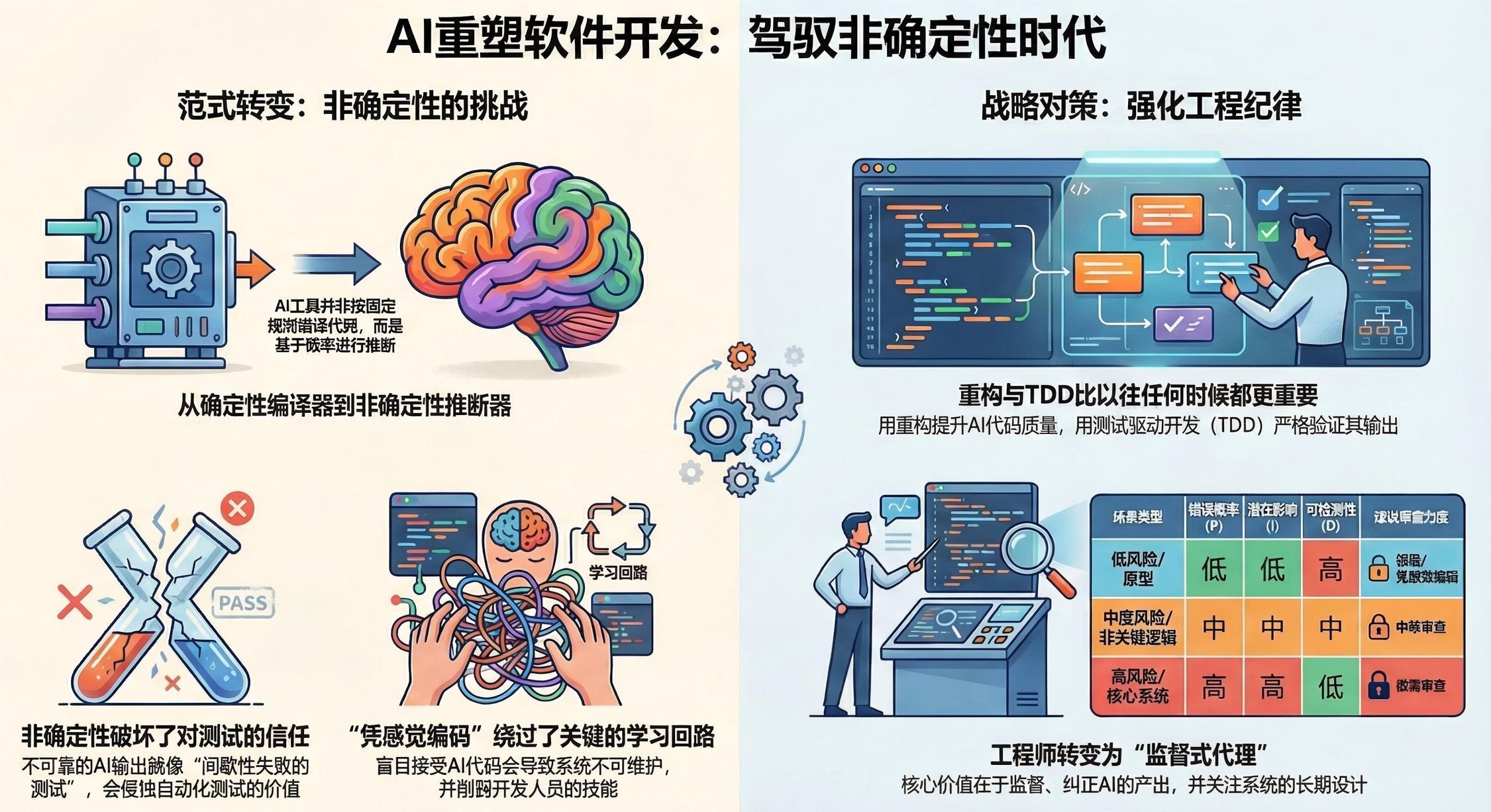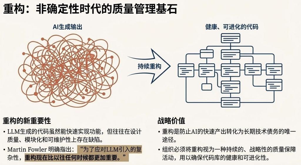3. 应对策略:质量管理、重构与风险评估面对非确定性编程带来的挑战,重构比任何以往都显得重要!组织必须 回归并强化最传统的、以质量为中心的工程实践。