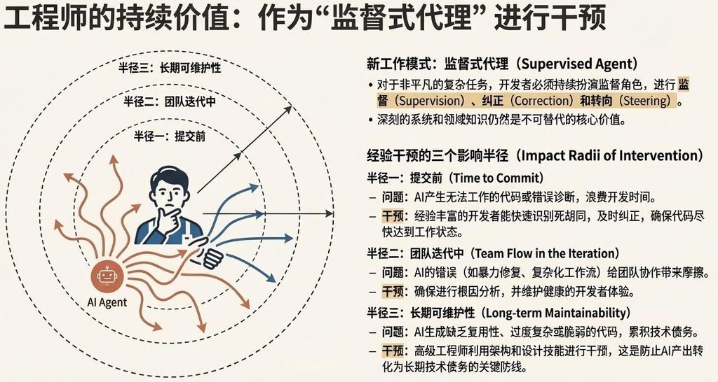 1.2 核心转变对工程师角色的影响 LLMs 自动化了中低层级的抽象任务,结构性地要求工程师将重心转移到更高层级的工作上。- 从编写代码到监督代理: 工程师的角色正在转变为 “监督式代理” (Supervised Agent)。他们需要具备 干预、纠正和引导 AI 生成结果的能力。- 高层次思维的加强: 开发者将有更多时间进行 高层次的思考、架构选择,并加强与业务方的协作,因为这始终是关键的瓶颈。- 新技能要求: 工程师需要学习如何与 LLM 工具交互、理解高层编程语言的形式主义,并掌握处理非确定性系统生成确定性运行代码的技能。对良好 API 设计和模块化知识的理解 将变得更加重要。