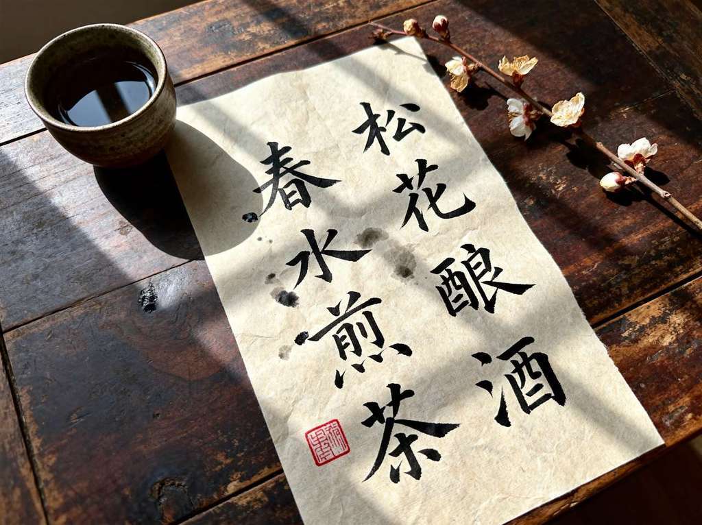 用黑色行楷毛笔字竖书“松花酿酒,春水煎茶”