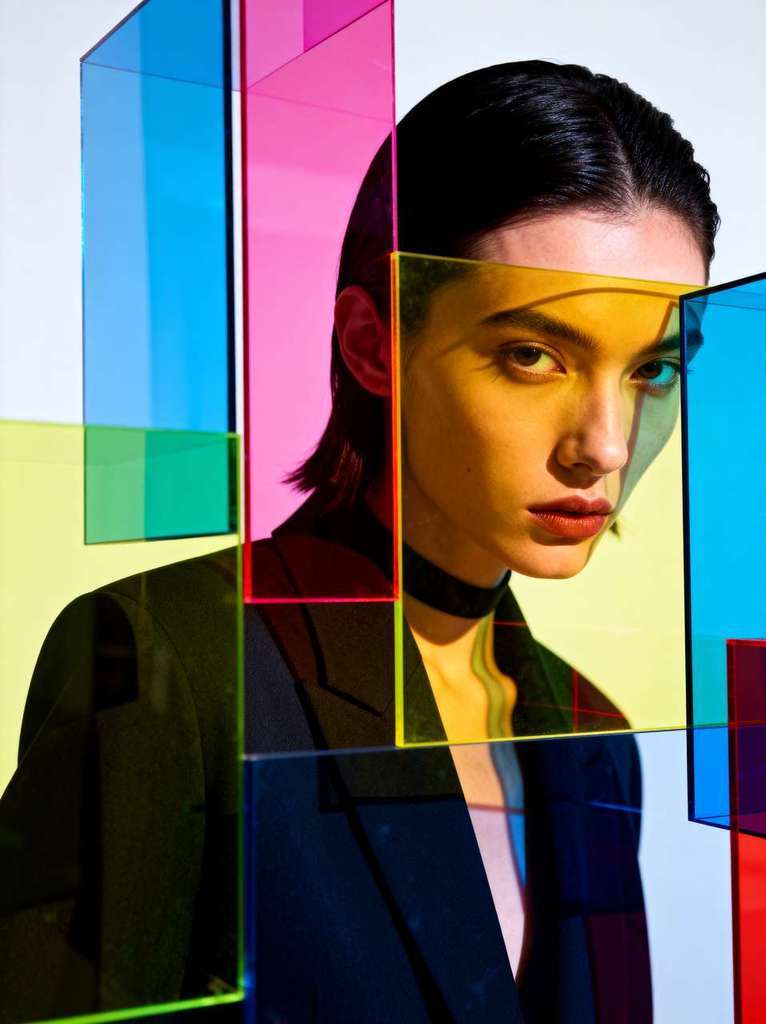 prompt:模特掩映于鲜艳半透明几何体中,光影交错,抽象艺术装置风。