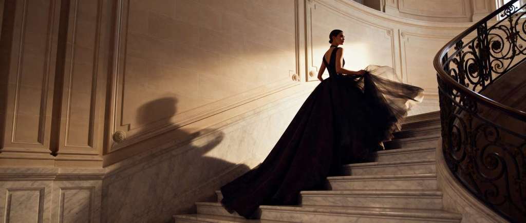prompt:模特身着蓬松礼服走下宏伟理石阶梯,室内奢华,柔和逆光,画面优雅经典,呈现 4k 电影级质感。