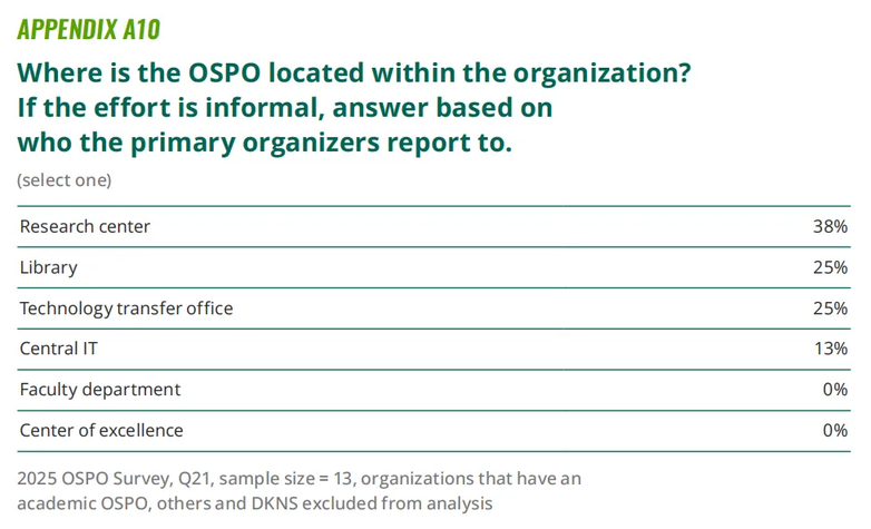 组织载体:贴近创新与知识传播。学术 OSPO 主要位于研究中心(38%)、图书馆(25%)、技术转移办公室(25%),这些载体能更好地连接学术研究与产业实践。