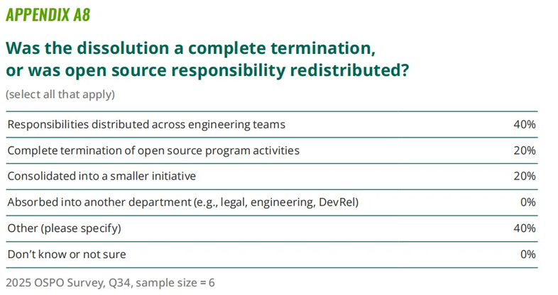 报告中一个值得警惕的数据是,部分组织因未能解决可持续性问题,导致 OSPO 解散或缩减:40%的解散 OSPO 将职责重新分配给工程团队,20%的相关人员面临裁员。这一后果的核心原因是:企业初期将 OSPO 视为短期合规工具,而非长期供应链战略资产,导致资源投入不足或战略定位模糊。