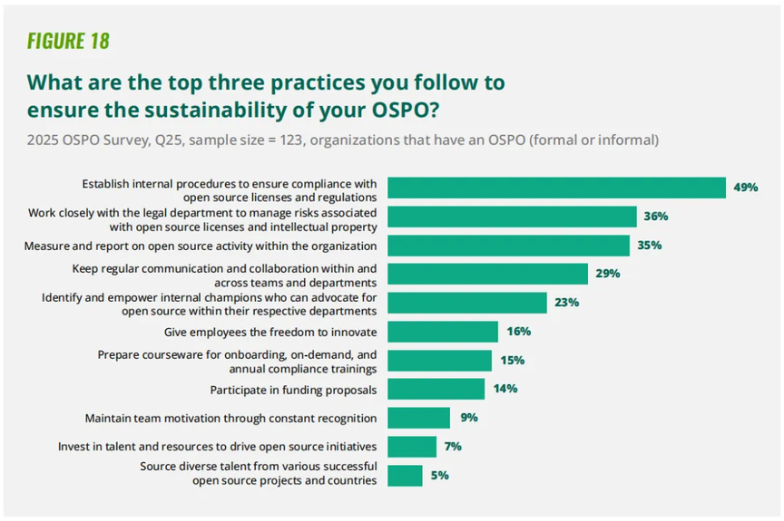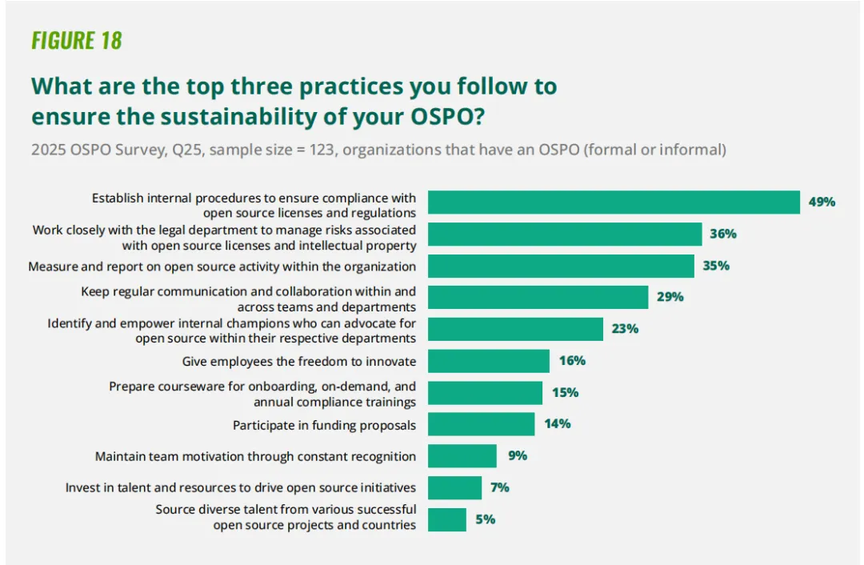 从合规实践看,49%的 OSPO 通过内部合规流程维持运营,36%联动法律团队进行开源许可证风险治理,35%建立开源活动透明化报告机制。这意味着 OSPO 能将被动合规转化为主动治理。