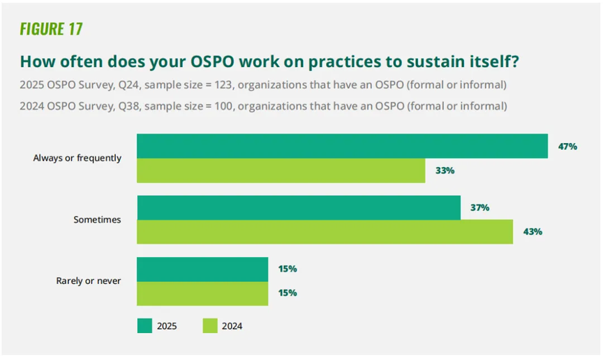 报告显示,47%的 OSPO“经常/始终”开展可持续性实践(较 2024 年的 33%显著提升),核心实践集中在三大维度: