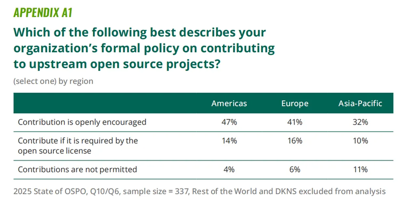 亚太:大企业引领,中小企业需轻量级突破。亚太地区 OSPO 渗透率较低(35%拥有 OSPO,21%正式、14%非正式),但呈现大企业主导特征:亚太地区 50%的正式 OSPO 来自大型/超大型企业,而中小企业中 55%的 OSPO 为非正式结构。此外,亚太地区 11%的组织“明确禁止上游贡献”,是全球最高比例,反映出部分企业对开源贡献仍持保守态度。