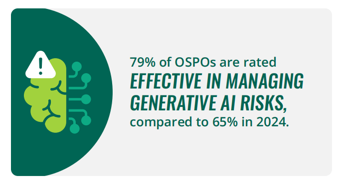 随着生成式 AI 在开发流程中的普及,AI 生成代码引入开源合规与安全风险成为新挑战。报告显示,79%的 OSPO 在管理生成式 AI 风险方面被评为“有效” ,较 2024 年的 65%提升 14 个百分点,而“无效”比例从 35%骤降至 21%。