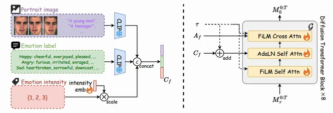为此,我们提出一种基于扩散-Transformer 架构的 3D 人脸动画生成模型 Cafe-Talk,通过融合粗粒度与细粒度的多模态控制条件实现同步优化。然而,多重条件的耦合性对模型性能提出了挑战。为解耦语音与细粒度控制条件,我们采用两阶段训练策略:首先仅基于语音音频和粗粒度条件预训练模型,随后通过提出的细粒度控制适配器(Fine-grained Control Adapter)逐步引入以动作单元(Action Units, AUs)表征的细粒度指令,避免对唇音同步的干扰。针对粗-细粒度条件的解耦,我们设计了交换标签训练机制(Swap-label training mechanism),确保细粒度条件的主导性,并开发了基于掩码的分类器无关引导技术(Mask-based Classifier-Free Guidance)以调节细粒度控制的强度。此外,通过文本-AU 对齐技术引入基于文本的检测器,支持自然语言用户输入,进一步扩展多模态控制能力。大量实验表明,Cafe-Talk 在唇形同步精度与表情自然度上均达到最先进水平,并在用户研究中获得细粒度控制的高接受度。