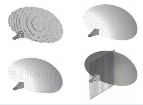 网格剖分方法:用于简单反射面天线的各种网格剖分策略 - 阶梯六面体、曲面四面体、曲面表面元以及 CST 的专有技术 PBA。
