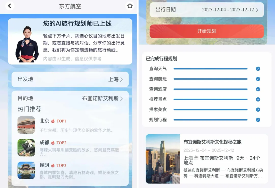 结合这条意义非凡的首航之旅,为提升顾客体验,东方航空接入阿里通义千问,推出国内航司首个行程规划 Agent,可快速精准解决航班组合、天气 &交通查询、时差换算、转机衔接、旅行规划等繁复问题。