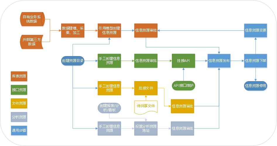 数据门户的前置工作是进行信息资源管理及发布,各种资源在此模块梳理分类并发布。这些信息资源主要有库表资源、接口资源、文件资源、分析资源四种资源。其中分析资源又包括看板、分析、报表等。最常用的库表资源,它是经过数据建模、采集加工形成高质量的数据资源,再通过简单的信息资源审批、发布流程后,在数据门户共享。