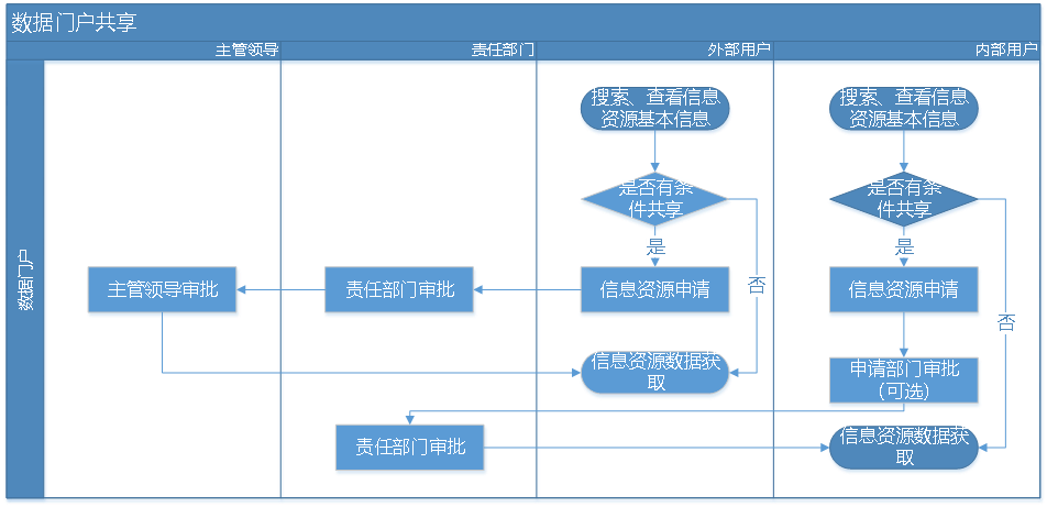 资源共享类型主要分为有条件、外部有条件、无条件、定向共享等。共享类型不同,审批流程不同,比如“有条件”,它的申请者是资源部门之外的用户,它的审批人是该部门的负责人。同时,可自主增加审批节点。“定向共享”,特别为某个部门共享,该部门人员查看资源无需申请。