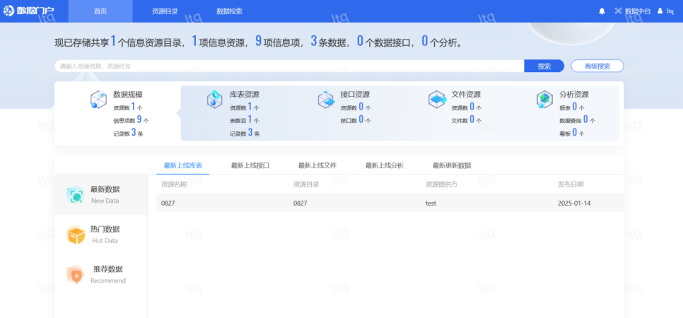 进入数据门户首页后,展示的是各类信息资源的多维统计信息。最上方总结性的文字,支持自定义配置,可按照用户命名资源的方式自行配置。左侧是推荐目录,比如最新数据、热门数据、推荐数据。最新数据,显而易见就是各类最新发布的资源;热门数据,在门户中,下载量与查看量较高的资源;推荐数据,用户评价得分较高的一类资源。