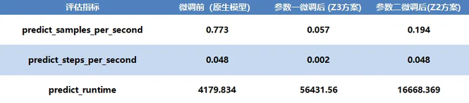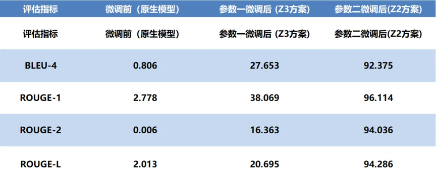下面的数据清晰地展示了模型在微调前后的巨大变化。其中,参数二(DeepSpeed Z2 方案)在各项文本生成质量指标上达到了最优水平。