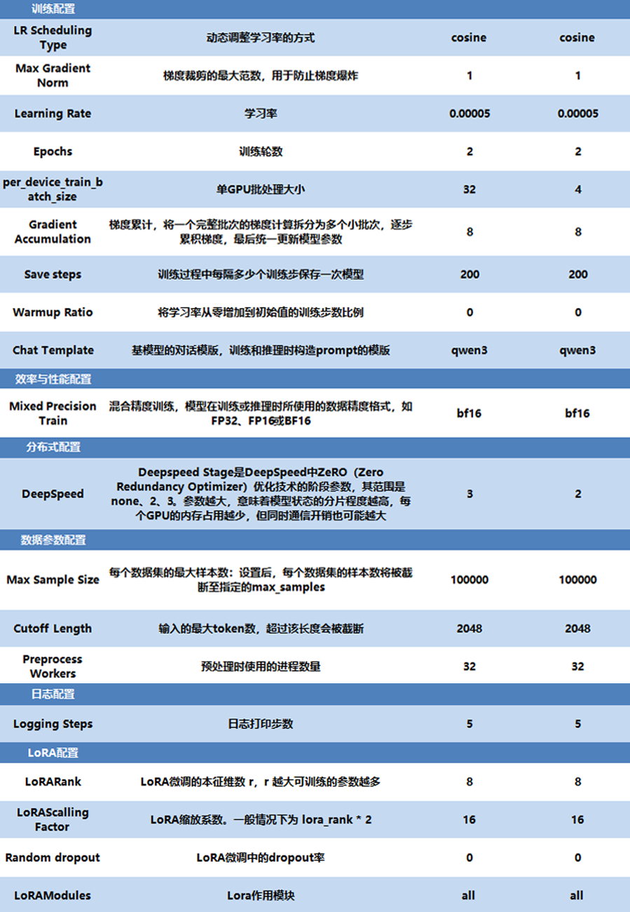 为验证上述发现,在任务模式下,我们对模型进行了两组微调实验(参数一和参数二),以评估不同配置的效果。两组实验的变量仅为 per_device_train_batch_size(32,4)和 DeepSpeed(3,2)参数,其他条件完全相同。具体参数差异如下表所示: