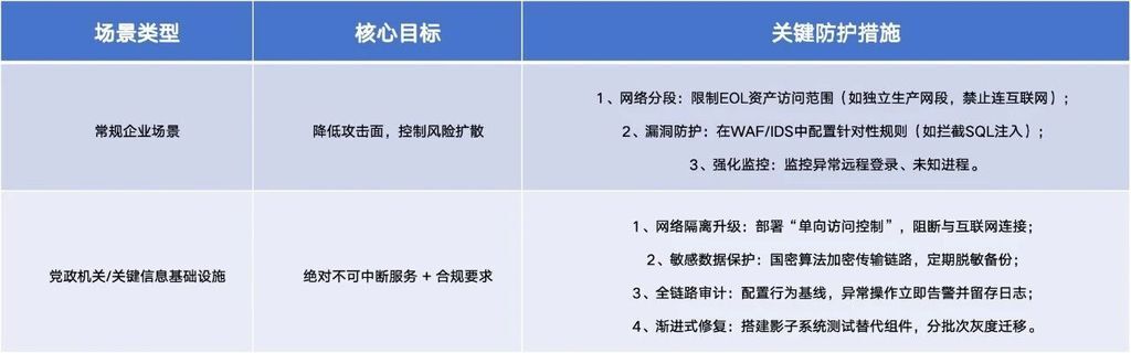 部分存量资产(如老旧工业控制系统、定制化 ERP)因业务绑定无法短期升级,需通过 SBOM 制定精准防护措施,常规场景与特殊场景(党政机关、关键信息基础设施)措施差异如下: