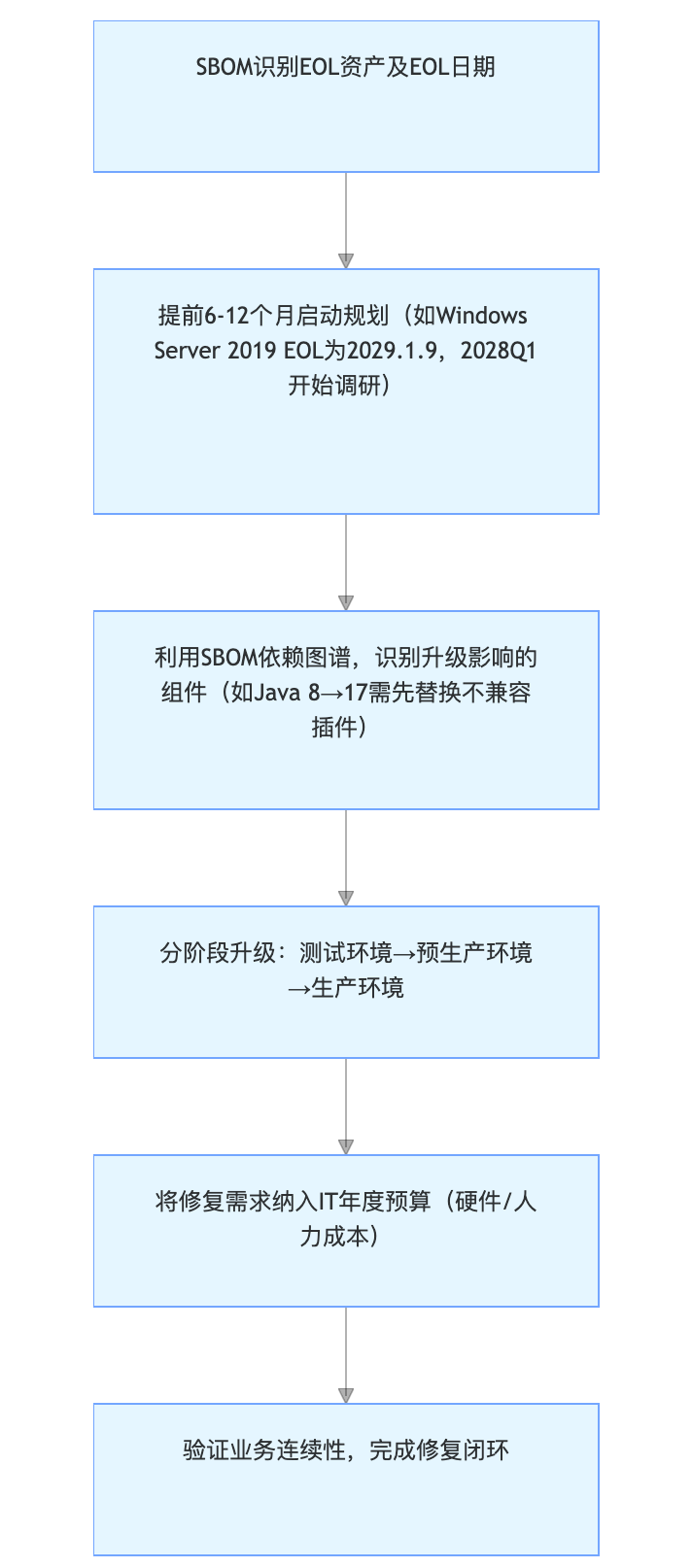 SBOM 的核心价值之一是精准定位存量资产中的 EOL/EOS 组件,这类组件正是技术债引发安全风险的“重灾区”。