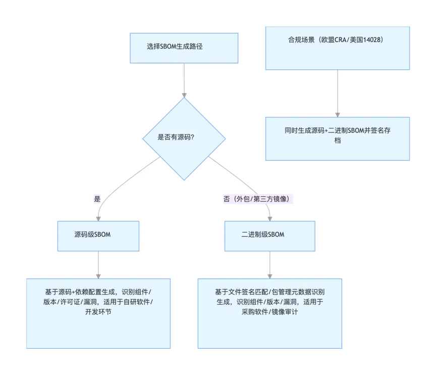 SBOM 可通过源码或二进制两种路径生成,需根据场景选择: