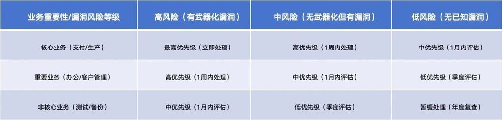 并非所有技术债都需紧急处理,企业需结合 SBOM 数据与业务实际,制定差异化优先级: