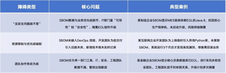 过时软件、终止生命周期(EOL/EOS)系统等技术债,早已潜藏于多数企业 IT 环境。停更的操作系统、无人维护的数据库、弃用的开源库虽还在撑业务,但 SBOM 的 “透明化能力”,进一步暴露了存量软件资产中的大量潜在风险。