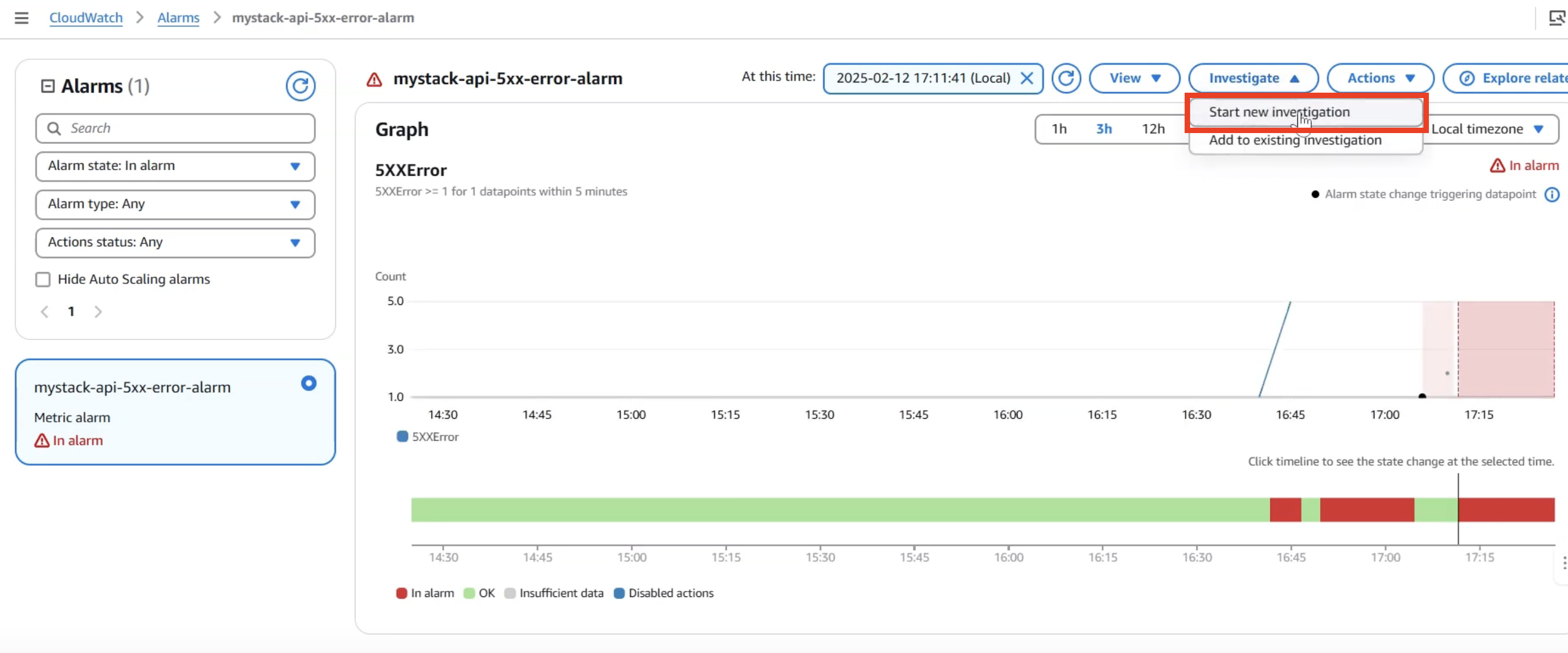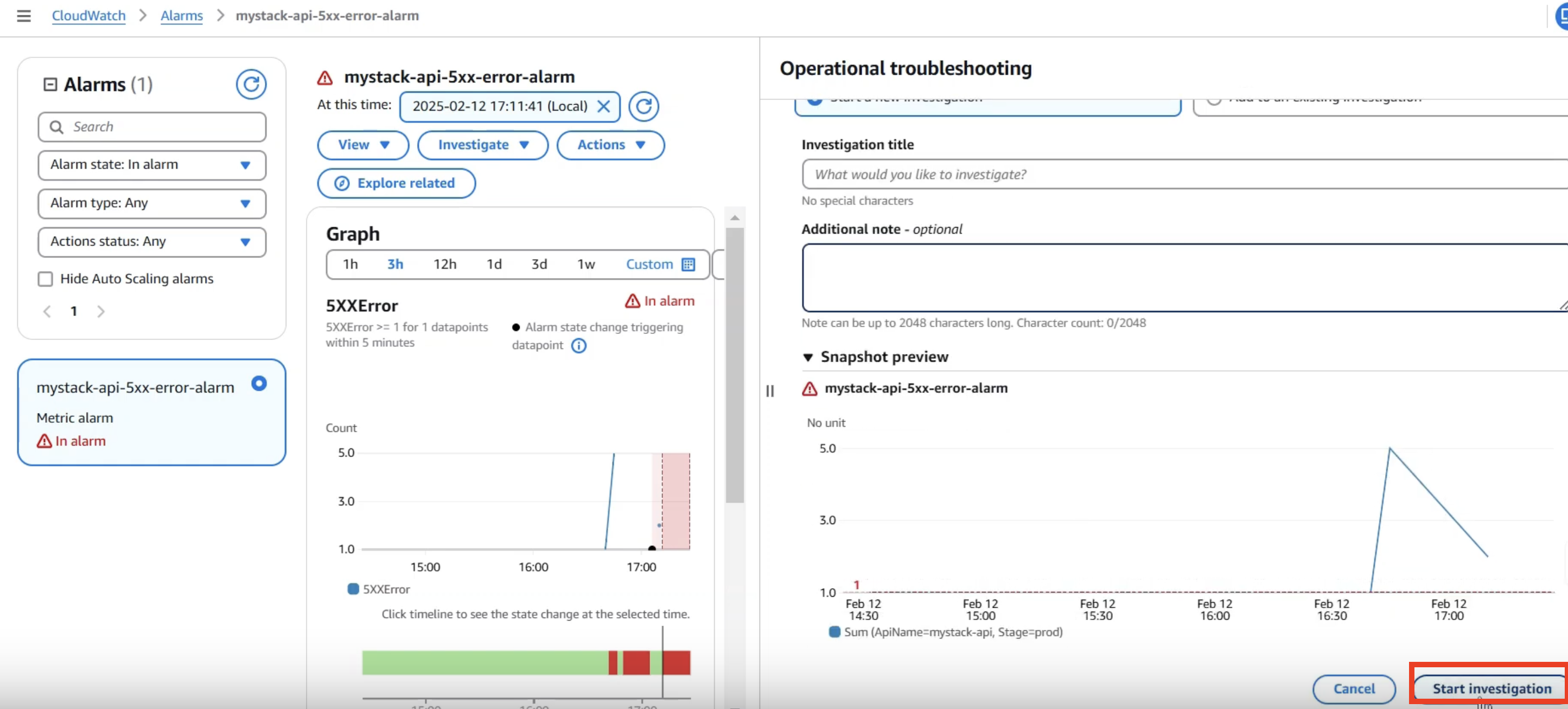 CloudWatch AIOps 将自动收集相关数据并开始分析。分析完成后,它会显示一个调查报告,包括: