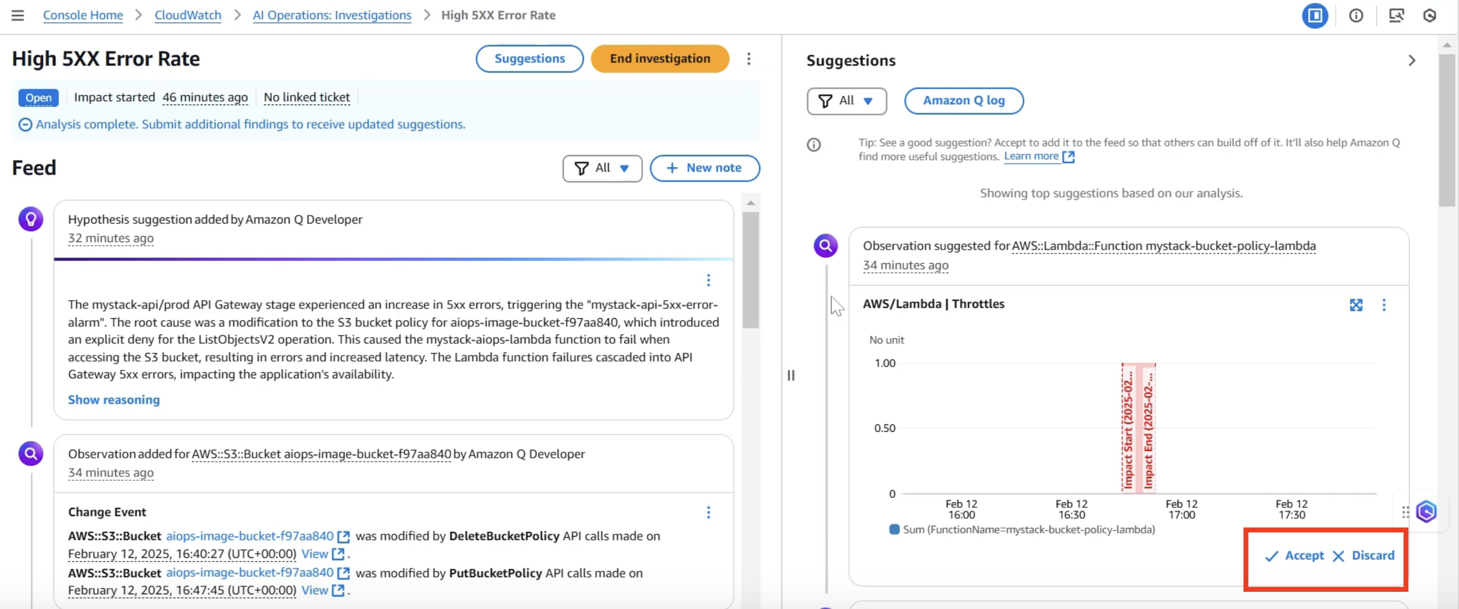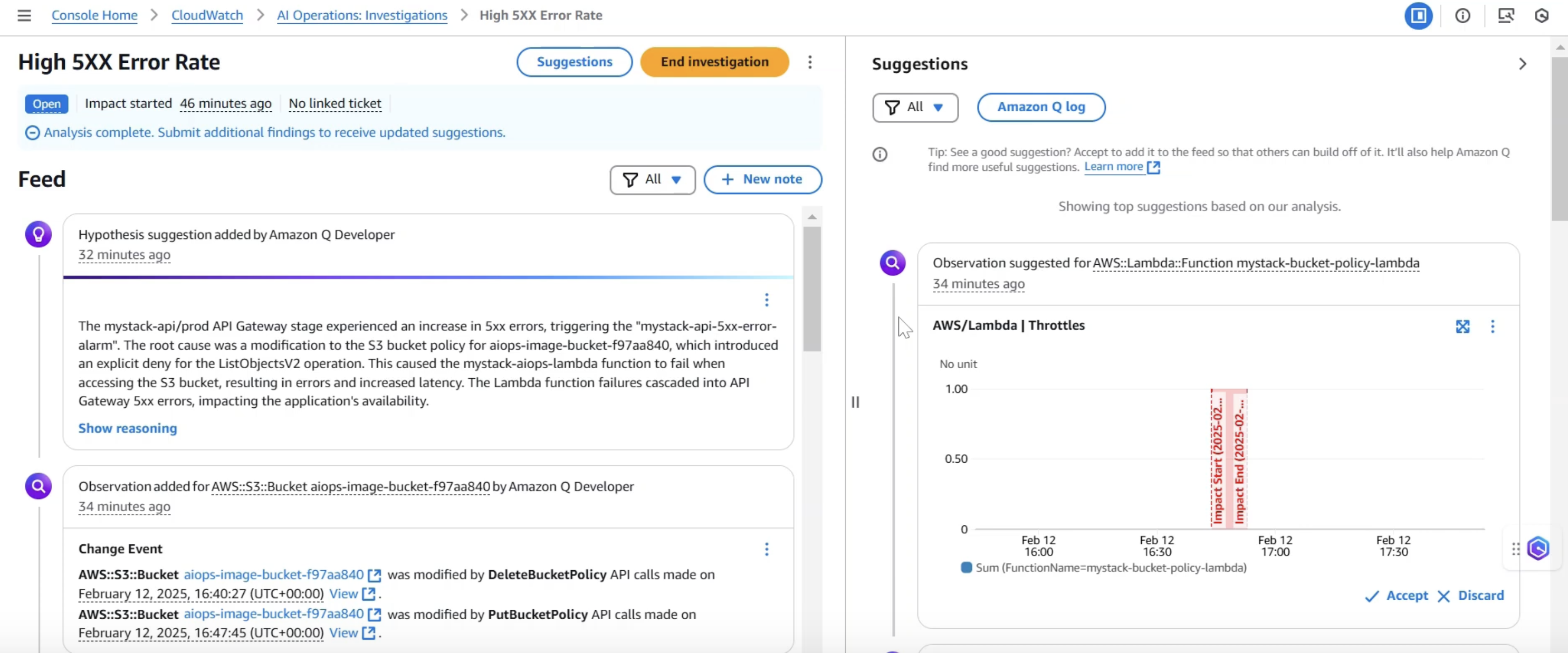 Amazon Q 将启动 CloudWatch AIOps 分析,并提供类似的调查报告