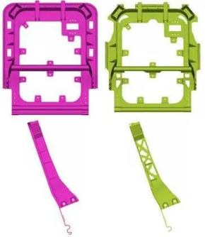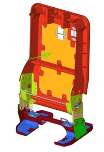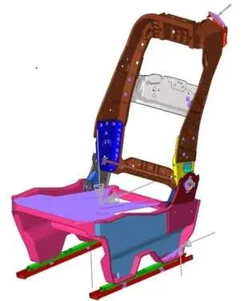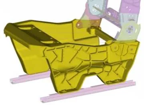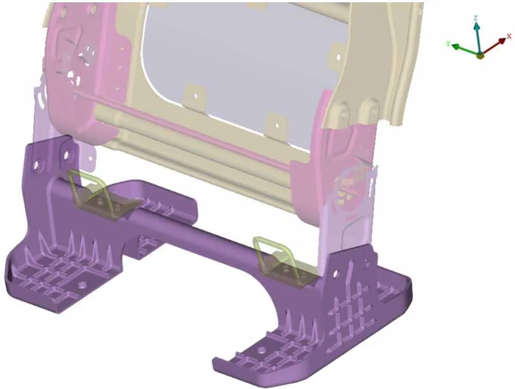 如第 1 章所述,座椅的性能分析工况包括静态刚强度、模态、动态冲击等数十种工况。在拓扑优化分析过程中,需要考虑优化效率和优化效果。包括优化迭代计算时间,收敛情况及优化结果合理性等。因此需要在数十种工况中选取关键工况做为拓扑优化分析时考察的工况。选取工况的主要原则是根据当前的性能状态,性能余量,工况的受力特点及历史分析数据结果等因素进行综合选取拓扑优化的分析工况。本文以某项目二排,三排座椅为例。该项目二排座椅坐垫骨架和靠背骨架,三排座椅脚架,靠背骨架和背板均为镁合金材料。二排、三排座椅骨架概念数据如图 4 和图 5 所示。