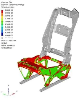 1)在座椅的概念设计阶段就介入仿真分析,通过使用拓扑优化进行座椅的正向结构设计,可以在设计自由度较高时确定最优的材料分布和形状。为了更准确地在概念阶段全面的考察主要性能分析工况,使用等效静态载荷法将冲击工况的非线性动态载荷转化为等效静态载荷,并与其他线性静态工况结合进行多学科多工况拓扑优化。概念阶段拓扑优化分析为减重降本设计打下良好的结构设计基础。同时,较传统的先设计后校核的方式相比,可以提前一轮进行性能仿真分析,提前提高产品设计成熟度。从而减少分析优化的轮次,缩短开发周期。拓扑优化方案整车减重约 2Kg,单车降本约 80 元。