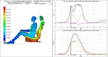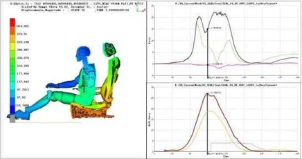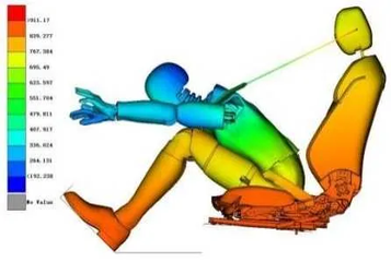 动态冲击工况主要考察车辆在行驶过程中,座椅可能会受到来自不同方向的动态冲击,如急刹车、碰撞等。通过仿真分析,可以模拟这些冲击工况,评估座椅的吸能能力和乘客的保护效果。如图 2 所示,正面碰撞分析工况。模拟车辆在正面发生碰撞时,座椅对乘客的保护效果。分析重点包括座椅的吸能性能、安全带的约束效果等。其他工况还包括后碰、头枕冲击、20G 冲击、鞭打等。