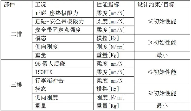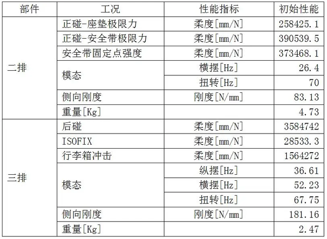 其中,二排座椅根据拓扑优化工况选取原则,选取 95 假人正碰工况,安全带固定点强度工况,侧向刚度工况和模态工况。三排座椅选取 95 假人后碰工况,ISOFIX 工况,行李箱冲击工况,侧向刚度工况和模态工况。初始设计方案性能见表 1。