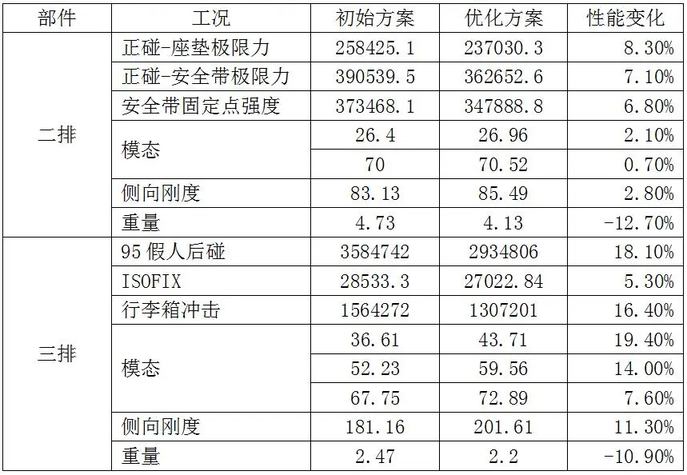 表 3 二排/三排座椅拓扑优化方案性能验证结果