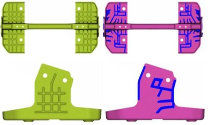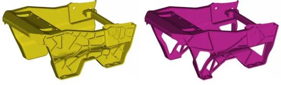 对于二排坐垫骨架和三排脚架,我们需要通过拓扑优化来确定最优的加强筋布置方式。因此,需要将优化空间进行包络填充。初始设计方案数据见图 9 和图 10。填充拓扑空间后数据见图 11 和图 12。