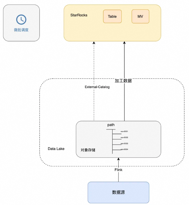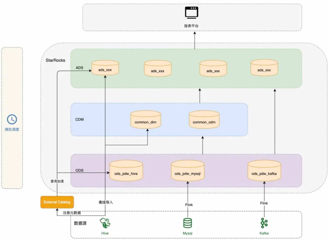 采用 Flink 消费 Kafka 或者 Flink CDC 直接消费业务库的 Binlog,以确保数据的新鲜度。这样,StarRocks 上 ODS 层的数据时效性也会得到保障。基于微批调度设置较小的间隔,能够为业务提供准实时的报表数据。